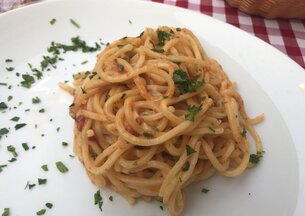 Spaghetti, egg, guanciale, extravirgin olive oil, pecorino cheese, black pepper